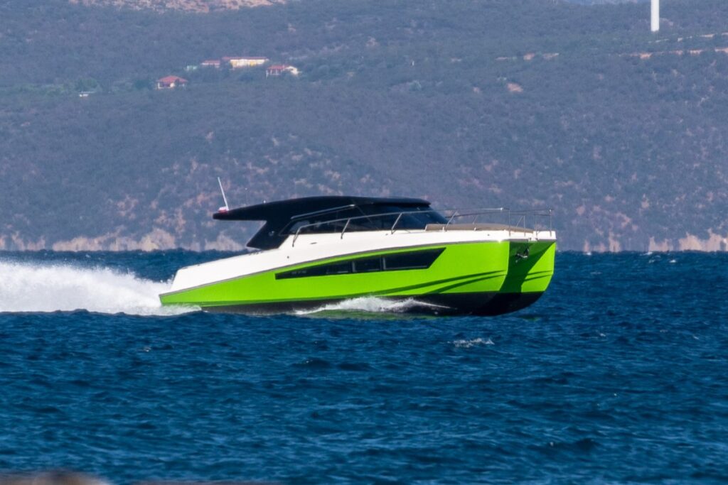 Equipaggiato con foil, Q-speed transmission ed una coppia di Yanmar 370 ha subito fatto segnare l’eccellente velocità di 45.7 knts ed una velocità di crociera di 34.2 Knts a 2.6l/NM